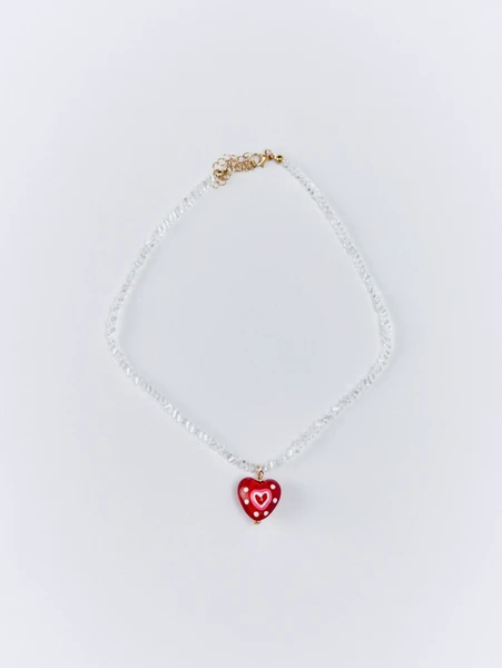БижутерияОткройте мир нежности и стиля для вашей маленькой модницы с очаровательным колье SELA. Это изящное украшение создано специально для девочек, чтобы подчеркнуть их индивидуальность и добавить ярких красок в повседневный образ. Центральным элементом является милая подвеска в форме красного сердечка, украшенная нежными белыми и розовыми деталями. Цепочка из прозрачных бусин элегантно дополняет дизайн, делая колье воздушным и легким.