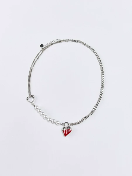 Дизайн колье тщательно продуман: одна половина цепочки выполнена из изящных искусственных жемчужин, придающих классический шарм, а другая — из модной серебристой цепи панцирного плетения. В центре композиции — очаровательная подвеска в виде сердца, украшенная яркой красной эмалью, которая добавляет акцент игривости и романтики. Цвет колье — серебристый с эффектными красными и белыми акцентами, что позволяет легко комбинировать его с разнообразными нарядами.