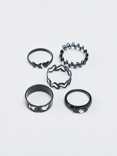 Каждое кольцо выполнено в элегантном черном цвете, что делает их универсальными и легко сочетаемыми с любой детской одеждой. В наборе вы найдете кольца с очаровательными элементами: