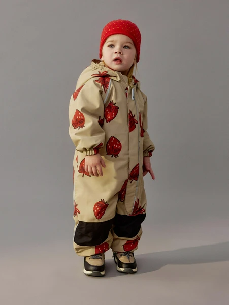 Изделие выполнено из инновационного полиэстера, который обеспечивает надежную защиту от ветра и влаги, позволяя при этом коже "дышать". Технология SELA Drytex гарантирует, что даже во время небольшой мороси ваш ребенок останется сухим и в тепле. Главная особенность комбинезона — очаровательный клубничный принт на светлом бежевом фоне, который несомненно поднимет настроение!