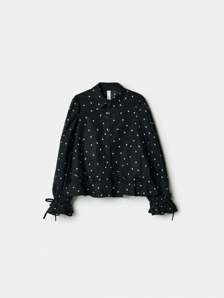 - Особенности: Эффектные пышные рукава с оборками и аккуратными завязками на манжетах добавляют блузке изысканности и уникальности.