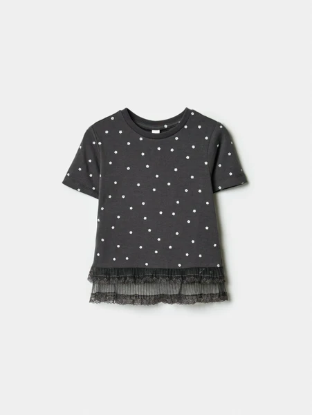 Познакомьтесь с новой жемчужиной детского гардероба – футболкой Sela с кружевными оборками для девочек. Эта модель идеально сочетает в себе стиль, комфорт и игривость. Выполненная в элегантном темно-сером оттенке, футболка украшена милым цветочным принтом, который добавит яркости в любой образ. Особое внимание привлекает изысканная деталь – воздушные кружевные оборки по низу изделия, создающие многослойный и праздничный вид.