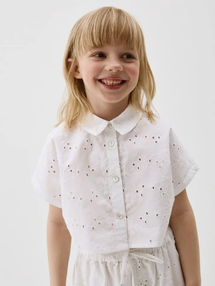 Главная изюминка рубашки – это изысканная перфорация, которая придает ей воздушность и уникальный шарм. Белый цвет делает ее невероятно универсальной, позволяя легко комбинировать с яркими юбками, джинсовыми шортами или элегантными брюками. Укороченный крой подчеркивает современный стиль, а классический воротничок и пуговицы добавляют нотку традиционной элегантности. Эта рубашка станет незаменимой вещью в летнем гардеробе, подходящей как для повседневных прогулок, так и для особых случаев. Она легко стирается и быстро сохнет, что особенно важно для детской одежды. Подарите своей дочери возможность выразить себя через стильный и удобный образ с этой очаровательной рубашкой!