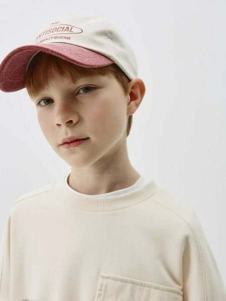Брюки и комбинезоныПредставляем модную и практичную бейсболку SELA Antisocial для мальчиков! Эта модель станет идеальным дополнением к летнему гардеробу вашего ребенка, обеспечивая не только комфорт, но и непревзойденный стильный внешний вид. Оригинальное и очень актуальное сочетание нежного бежевого цвета основы и яркого, динамичного бордового козырька выделяет эту бейсболку среди прочих, делая ее настоящим акцентом в образе. Дерзкая надпись 'ANTISOCIAL' на фронтальной части подчеркнет индивидуальность и характер юного владельца, позволяя ему выразить себя.