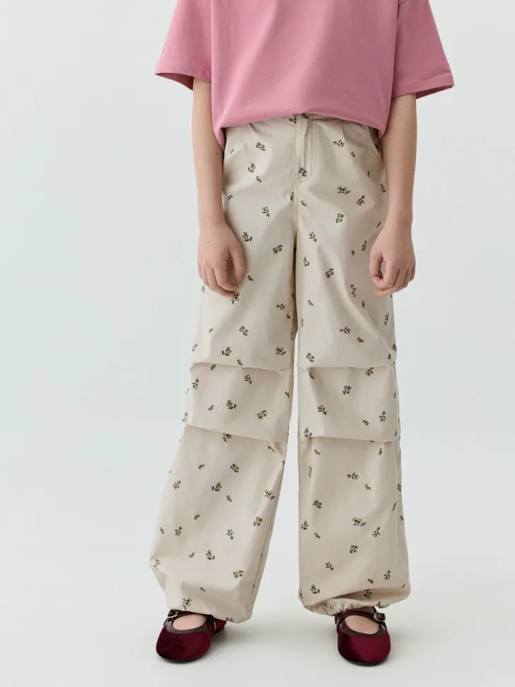Особый шарм этим брюкам придает милый, ненавязчивый принт, который легко сочетается с любым верхом – от простых футболок до нарядных блузок. Модель "парашют" не только в тренде, но и чрезвычайно практична. Регулируемый пояс и эластичные манжеты по низу гарантируют идеальную посадку и долгий срок службы. Ваша дочка будет в восторге от их уникального стиля и ощущения легкости! Прекрасный выбор для создания модных, практичных и ярких образов на каждый день.
