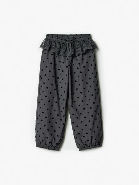 Особое внимание привлекает изысканная кружевная оборка на поясе, которая добавляет нотку элегантности и нежности. По всей поверхности брюк расположен очаровательный принт в виде черных сердечек, создающий игривое и романтичное настроение. Модель выполнена в универсальном темно-сером цвете, что позволяет легко комбинировать ее с различными элементами гардероба и создавать уникальные образы для любого случая.