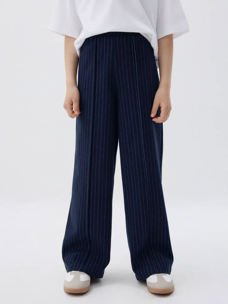 Выполненные в классическом темно-синем цвете с тонкими белыми полосками, они легко вписываются как в школьный дресс-код, так и в повседневные или праздничные образы. Широкий крой обеспечивает свободу движений, а качественный материал гарантирует долговечность и простоту в уходе. Эластичный пояс обеспечивает идеальную посадку без дискомфорта. Комбинируйте их с различными топами, блузками или свитшотами, создавая бесчисленное множество стильных ансамблей. Эти брюки станут незаменимым элементом гардероба вашей девочки, предлагая ей уверенность и неповторимый стиль.