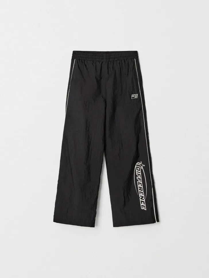 Эти брюки легко комбинируются с любой футболкой, худи или топом, создавая разнообразные образы – от спортивных до повседневных. Эластичный пояс обеспечивает надежную и комфортную посадку, не сдавливая животик. Добавьте в гардероб вашей дочки универсальность и трендовый дизайн с этими широкими нейлоновыми брюками! Они не только выглядят стильно, но и выдерживают частые стирки, сохраняя свой первоначальный вид. Отличный выбор для активных и стильных девочек!
