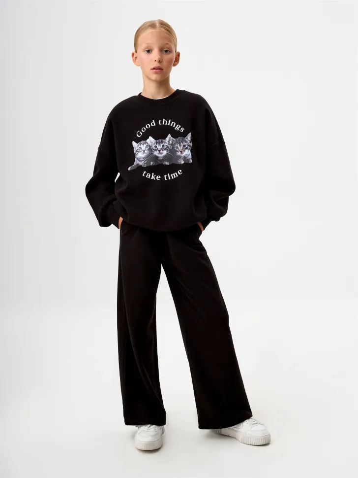 Модель отличается современным дизайном с широкими штанинами, который не только выглядит стильно, но и обеспечивает дополнительный комфорт. Эластичный пояс гарантирует идеальную посадку на любую фигуру, не сдавливая и не оставляя следов. Эти брюки легко сочетаются с разнообразными элементами гардероба: от спортивных футболок и толстовок до элегантных блузок, позволяя создавать множество уникальных и модных образов. Они станут незаменимой частью гардероба вашей девочки, предлагая безупречное качество и долговечность даже при частой стирке.