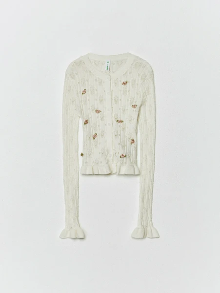 Кардиган выполнен из высококачественного материала с деликатным ажурным плетением, которое придает ему особую утонченность. Милый декор, расположенный по всей поверхности, добавляет игривости и уникальности. Особое внимание уделено деталям: