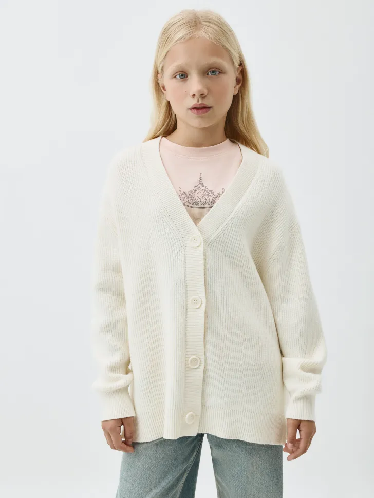 Кардиган обладает универсальным дизайном: V-образный вырез и удобные пуговицы позволяют носить его как самостоятельный элемент или поверх блузок, футболок и водолазок. Белый цвет легко комбинируется с другими оттенками, делая эту вещь невероятно практичной. Высокое качество материалов обеспечивает долговечность и легкость в уходе, сохраняя форму и цвет даже после многочисленных стирок. Позвольте вашей дочери чувствовать себя уютно и выглядеть модно в любое время года с этим очаровательным кардиганом.