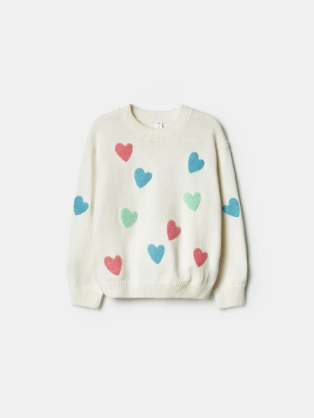 Особое очарование джемперу придает яркая вышивка в виде разноцветных сердечек, которая добавит игривости и позитива в любой повседневный образ.