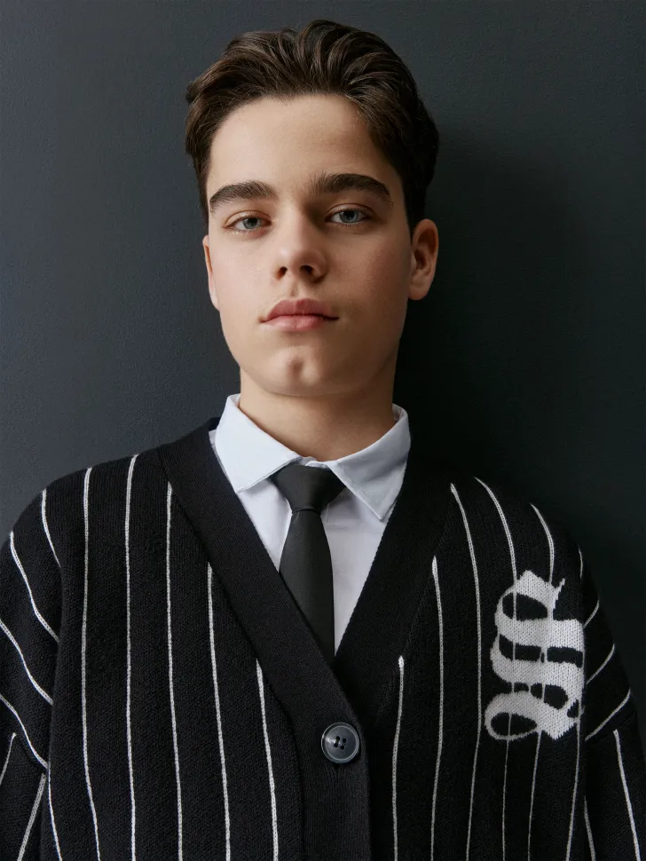 Этот стильный кардиган представлен в универсальной черно-белой гамме с эффектными вертикальными полосками, что делает его легко комбинируемым с разнообразной одеждой – от повседневных джинсов до школьной формы. На груди расположен оригинальный шеврон, добавляющий изделию уникальности. Идеально подходит как для мальчиков, так и для девочек, он станет прекрасным выбором для школы, прогулок или уютных домашних вечеров. Позвольте вашим детям выглядеть модно и чувствовать себя комфортно каждый день!