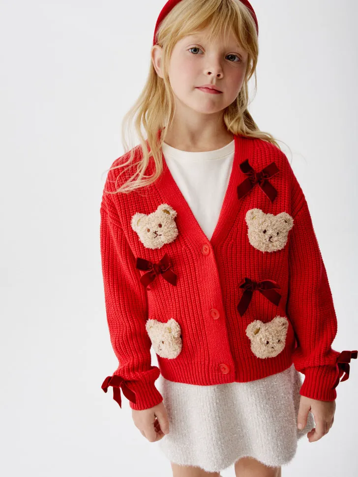 Представляем очаровательный вязаный кардиган для девочек — идеальное дополнение к гардеробу вашей маленькой принцессы! Этот уютный кардиган насыщенного красного цвета, украшенный милыми объемными аппликациями в виде плюшевых мишек и игривыми бархатными бантиками, создан для того, чтобы дарить тепло и радость. Мягкая вязка обеспечит комфорт в прохладную погоду, а стильный дизайн подчеркнет индивидуальность вашей дочки.