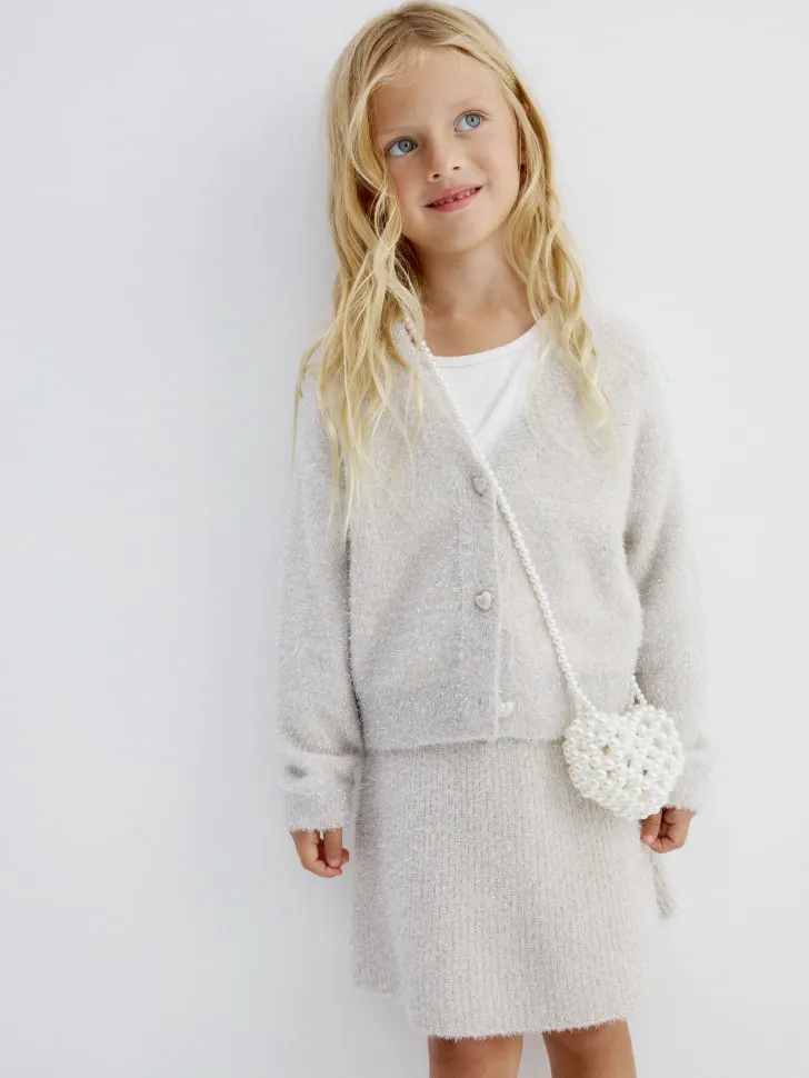 Кардиган выполнен из высококачественной мягкой пряжи, которая приятна на ощупь и не вызывает раздражения, что крайне важно для нежной детской кожи. Деликатное вплетение люрексной нити придает изделию изысканный мерцающий эффект, делая его по-настоящему особенным. Продуманный крой обеспечивает полную свободу движений, позволяя ребенку чувствовать себя легко и комфортно в течение всего дня. Модель универсальна и легко сочетается с различными элементами одежды: от повседневных джинсов и топов до элегантных платьев и юбок. Простота в уходе и долговечность делают этот кардиган практичным выбором для родителей, ценящих качество и функциональность. Подарите вашей девочке не только тепло, но и возможность выразить свой индивидуальный стиль с этим прекрасным кардиганом!