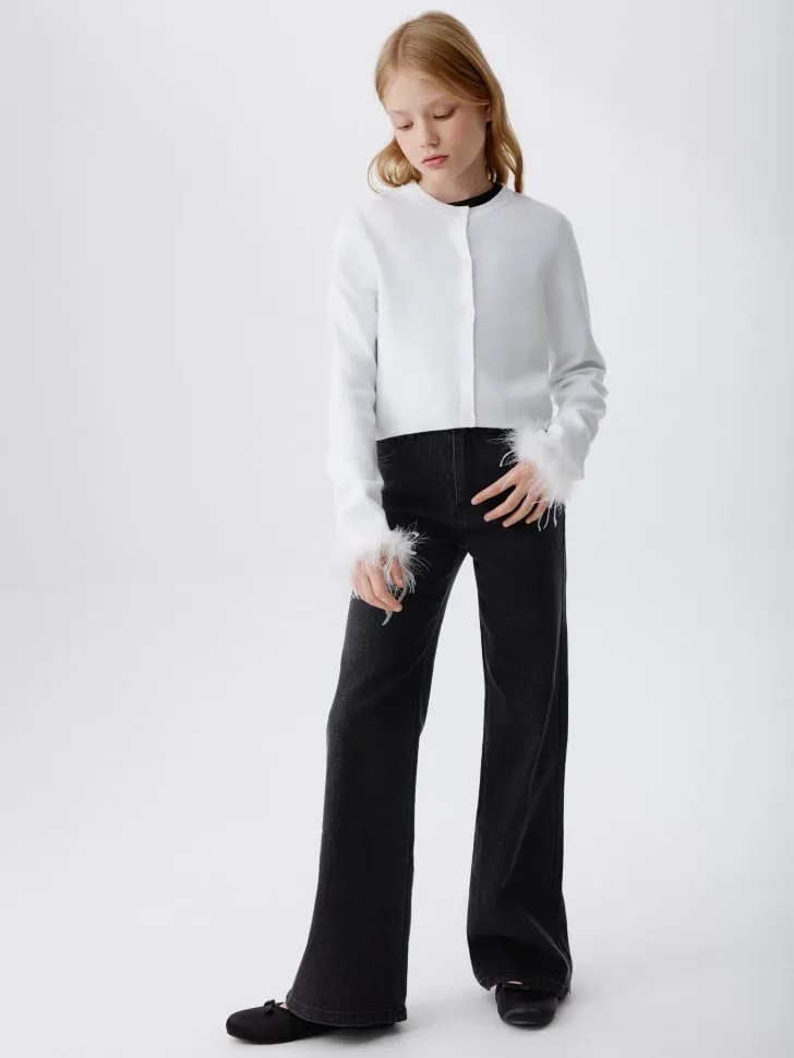 Откройте мир стиля и комфорта для вашей дочери с нашими эксклюзивными джинсами Bootcut с люрексом! Эта модель — идеальный выбор для тех, кто ценит как моду, так и удобство. Классический крой bootcut, расширяющийся от колена, создает элегантный и современный силуэт, который прекрасно смотрится на любой фигуре. Особенностью этих джинсов является тонкая люрексовая нить, вплетенная в ткань, которая придает изделию деликатное мерцание и неповторимый шарм. Это позволяет легко превратить повседневный образ в праздничный, не меняя одежды.