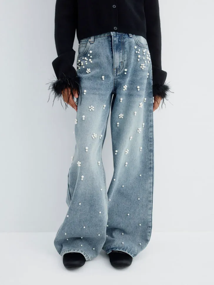 Джинсы Loose fit с жемчужным декором, голубой, арт. art0001