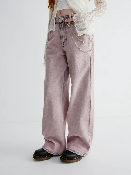 Особое внимание привлекает трендовая декоративная цепочка, которая добавляет модели уникальности и подчеркивает индивидуальность. Розовый цвет с легким эффектом «варенки» позволяет легко комбинировать джинсы с разнообразной одеждой и обувью, открывая простор для создания множества стильных комплектов.