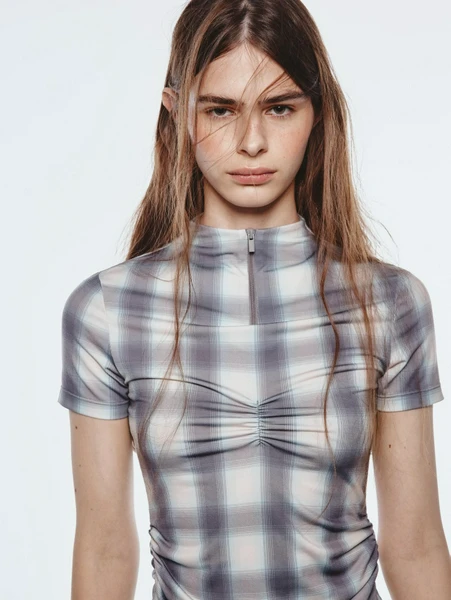 - Элегантный дизайн: Футболка выполнена с воротником-стойкой и удобной молнией, что позволяет регулировать глубину выреза. Укороченный рукав и приталенный силуэт подчеркивают изящество фигуры.