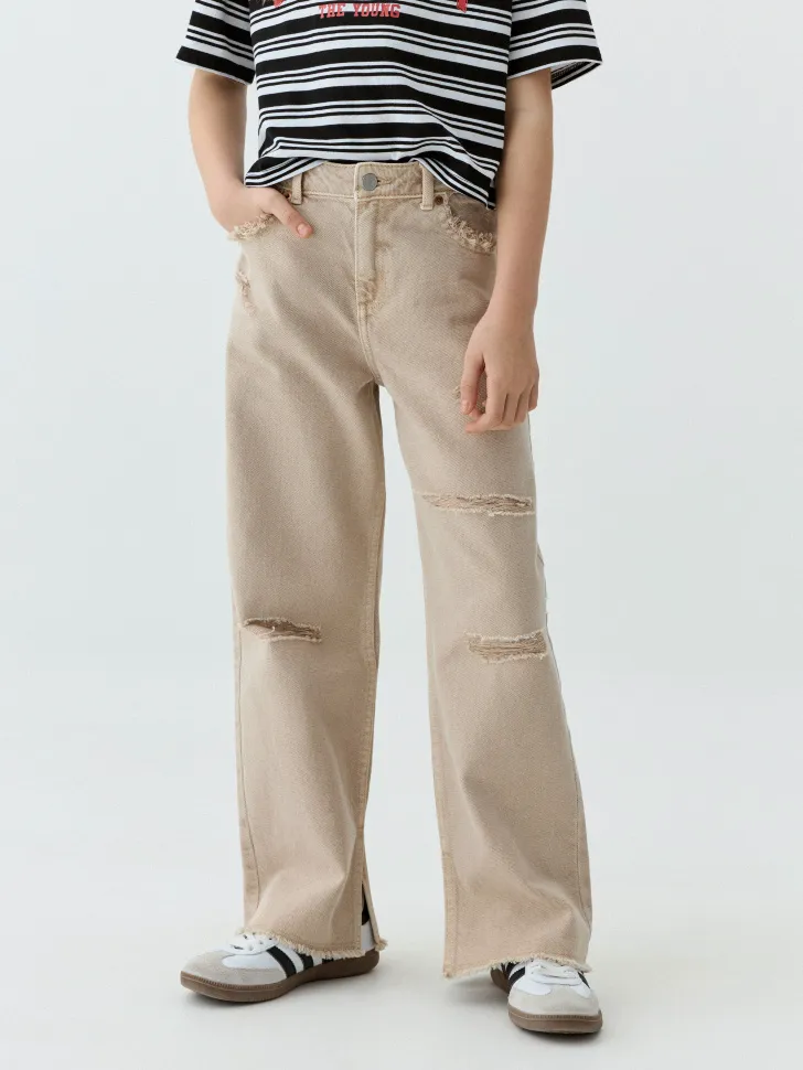 Представляем вашему вниманию стильные и ультрамодные рваные джинсы Wide Leg, разработанные специально для юных модниц, которые ценят комфорт и следуют последним трендам. Эти джинсы бежевого цвета с эффектными разрезами на коленях и бедрах создают непринужденный, но в то же время очень актуальный образ. Свободный крой Wide Leg и высокая посадка обеспечивают идеальную посадку по фигуре и неограниченную свободу движений, что делает их незаменимыми для активного образа жизни.