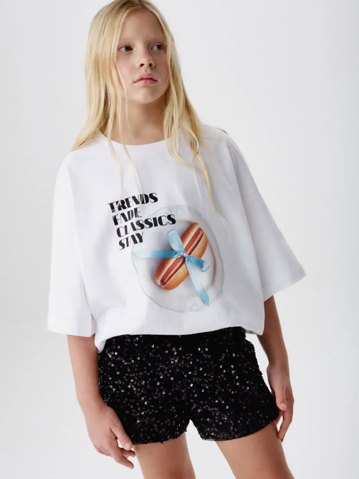 Свободный крой оверсайз дарит полную свободу движений, что особенно важно для активных детей. Особенностью этой футболки является оригинальный новогодний принт – необычное сочетание праздничной тематики с надписью "Trends fade, Classics stay", который привлекает внимание и поднимает настроение, делая каждый образ неповторимым. Она прекрасно сочетается как с повседневными джинсами, так и с нарядными шортами или юбками для создания праздничного ансамбля. Подчеркните индивидуальность вашей дочери и подарите ей ощущение волшебства с этой эксклюзивной футболкой! Идеально для подарка или создания особенного лука на праздничные мероприятия. Легкий уход и долговечность материала гарантируют, что футболка будет радовать свою обладательницу не один сезон.