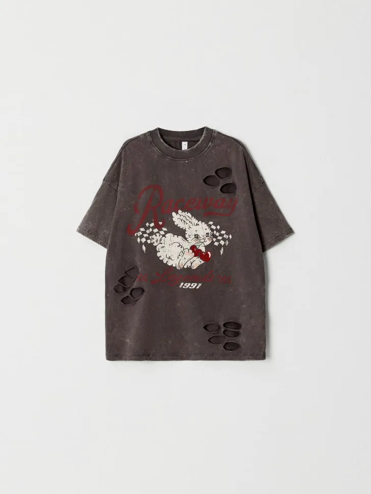 Особую изюминку футболке придает уникальный винтажный принт: милый кролик с гоночными флагами, надписью "Raceway" и годом "1991". Эти детали создают образ, полный динамики и свободы. Эффектные рваные элементы по всей поверхности добавляют современности и дерзости, подчеркивая индивидуальность. Свободный крой оверсайз гарантирует идеальную посадку и позволяет легко комбинировать футболку с различными элементами гардероба — от джинсов и кед до модных юбок. Подарите вашей дочке возможность выразить свой стиль с этой уникальной футболкой!