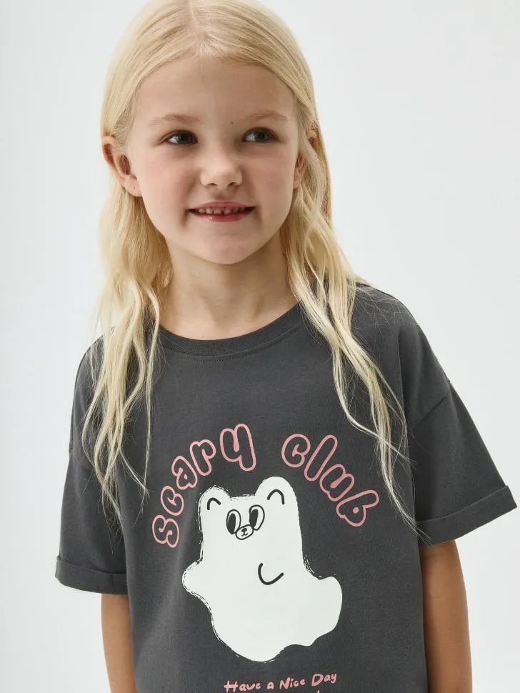 Принт с забавным призраком и надписью "Scary Club" придает футболке особый шарм и индивидуальность, идеально подходя для тематических мероприятий или просто для создания яркого повседневного образа. Футболка выполнена из качественного материала, который приятен к телу и обеспечивает долговечность изделия. Практичный темно-серый цвет основы легко сочетается с различными элементами гардероба. Подарите своей девочке комфорт и возможность выразить себя с этой уникальной футболкой, которая станет ее любимой вещью!