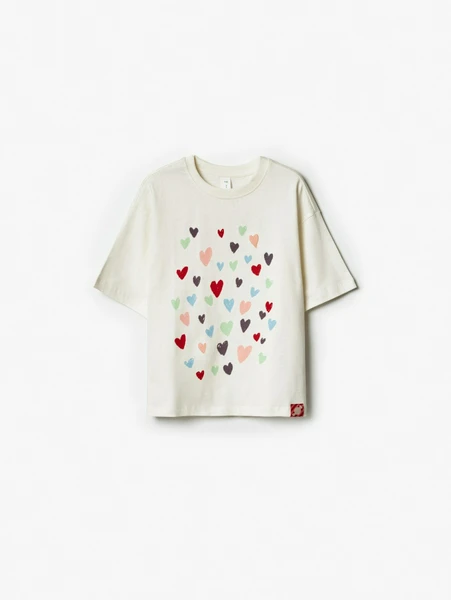 - Яркий принт с сердечками: Милые разноцветные сердечки добавляют футболке игривости и позитивного настроения. Это отличный способ выразить индивидуальность!