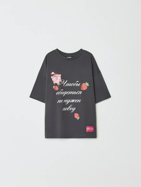 На футболке изображена очаровательная Нюша из любимого мультфильма «Смешарики» в окружении сочных клубничек, а игривая надпись «Чтобы обидеться не нужен повод» добавит позитива в каждый день. Темно-серый цвет является универсальной базой, позволяя легко комбинировать футболку с самой разнообразной одеждой из детского гардероба. 🍓
