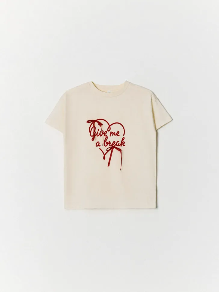 Центральным элементом дизайна является уникальный принт, выполненный в виде изящной надписи "Give me a break", эффектно обрамленной стилизованным сердцем и дополненной милыми декоративными элементами в виде красных ленточек, что придает изделию особый шарм. Лаконичный и нежный бежевый оттенок основы позволяет легко комбинировать футболку с различными элементами гардероба — от классических джинсов до нарядных юбок. Эта футболка станет прекрасным выбором для повседневного использования, школьных мероприятий или особых случаев, эффективно подчеркивая индивидуальность, чувство стиля и хороший вкус вашей девочки.