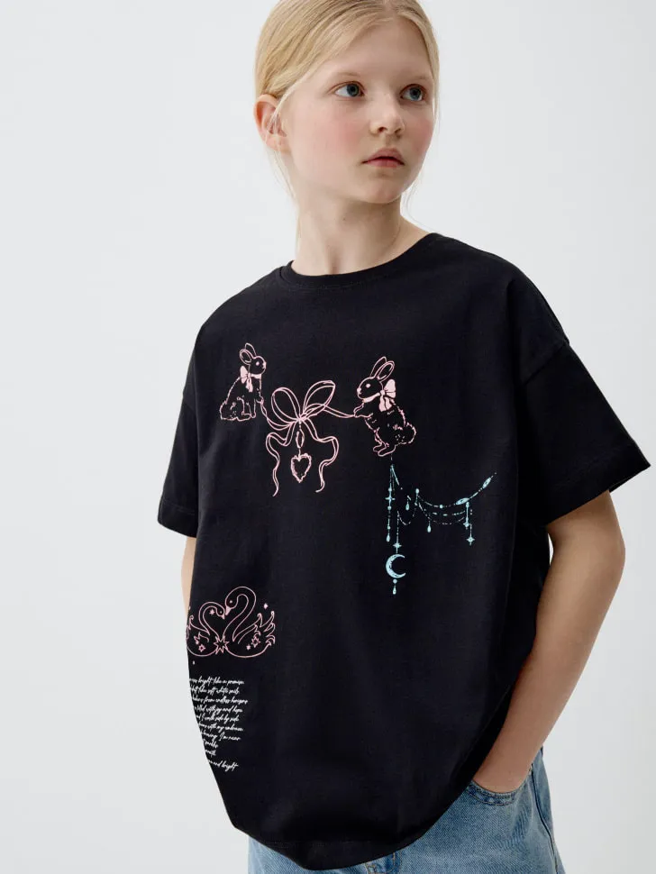 Представляем идеальную футболку с принтом для юных модниц! Эта футболка — воплощение комфорта и стиля, созданная специально для девочек, которые любят выделяться. Изготовлена из мягкого, дышащего материала, она обеспечит максимальное удобство в течение всего дня, будь то активные игры на улице, поход в школу или встреча с подругами.