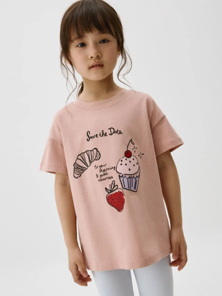 Футболка выполнена из высококачественного, дышащего материала, обеспечивающего максимальный комфорт даже в самые жаркие дни. Свободный крой гарантирует полную свободу движений, что особенно важно для активных девочек. Главная изюминка — это милый и яркий принт с изображением аппетитного круассана, нежного кекса и сочной клубники, дополненный вдохновляющей надписью "Save the Date to new beginnings & good memories". Такой дизайн обязательно поднимет настроение! Модель легко сочетается с различными элементами гардероба: джинсами, шортами, леггинсами или юбками. Она идеально подойдет для прогулок, детского сада, занятий спортом или просто для домашнего отдыха. Выбирая эту футболку, вы дарите своему ребенку не только стильную одежду, но и частичку радости и беззаботности.