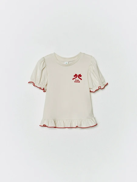Представляем очаровательную футболку с рукавами-фонариками, созданную специально для юных принцесс! Эта модель станет идеальным дополнением к повседневному или праздничному гардеробу вашей дочери. Выполненная в нежном бежевом оттенке, футболка украшена изящными красными деталями: игривой оборкой по краю рукавов и низу, а также милым принтом в виде бантика с надписью "true match" на груди.