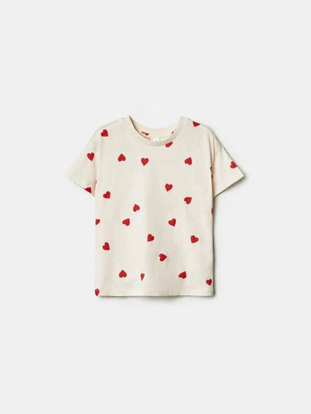 Что делает эту футболку по-настоящему особенной? Конечно же, её милый принт! Множество красных сердечек рассыпаны по светло-бежевому полотну, создавая игривый и очень модный образ. Это идеальный выбор для маленьких принцесс, которые любят выражать свою индивидуальность. Свободный крой и аккуратная круглая горловина гарантируют удобство и не стесняют движений.
