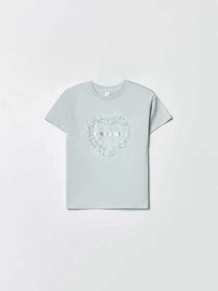 Дизайн футболки продуман до мелочей: центральный акцент — это стильный принт в виде сердца, окруженного воздушными оборками, добавляющими изделию изящества и уникальности. Надпись "excuse me" привносит легкую игривую нотку. Модель идеально подходит для повседневного использования, будь то школьные будни, прогулки в парке или веселые встречи с друзьями.