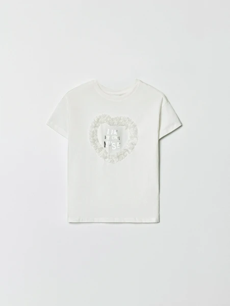 Дизайн футболки заслуживает особого внимания: на груди расположен нежный принт в форме сердца с игривыми оборками и вдохновляющей надписью "I AM MY OWN MUSE". Белый цвет футболки легко комбинируется с любой одеждой, позволяя создавать множество стильных образов. SELA заботится о деталях: