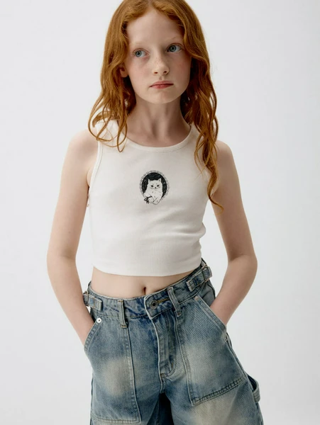 Стильный и комфортный укороченный топ от SELA – идеальный выбор для летнего гардероба вашей девочки. Этот очаровательный топ молочного цвета, украшенный милым принтом с котиком, добавит игривости и свежести в любой образ.