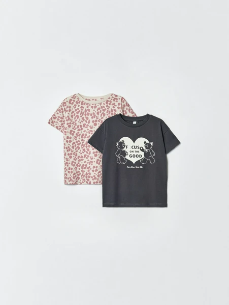 - Дизайн: В наборе вы найдете две уникальные модели: одна футболка выполнена в молочном цвете с игривым леопардовым принтом, а вторая – в темно-сером оттенке с очаровательным принтом медвежат и мотивирующей надписью.