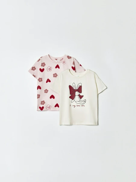 - Первая футболка: нежного розового цвета, украшенная милыми сердечками и цветочными мотивами.