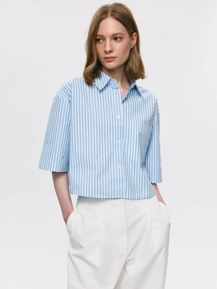 Представляем укороченную рубашку в полоску – идеальное решение для создания стильных и свежих летних образов! Эта рубашка станет незаменимым элементом вашего гардероба благодаря своей универсальности и модному дизайну. Классический узор в полоску всегда актуален, а укороченный крой придает ей современный и игривый вид.
