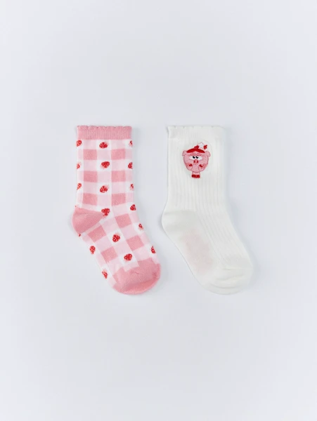 - Вторая пара: классические белые носочки, украшенные трогательной и детализированной вышивкой розового поросёнка. Они добавят нотку индивидуальности, веселья и нежности, подчеркивая индивидуальность вашей малышки.