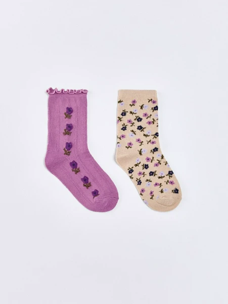 - Сиреневые носки с изящной объемной вышивкой в виде цветов и милым рюшем по верхнему краю, добавляющим нежности и романтичности.
