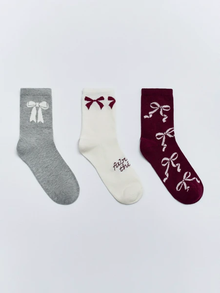 - Яркие бордовые носки с изящными светлыми бантиками, которые станут акцентной деталью любого наряда.