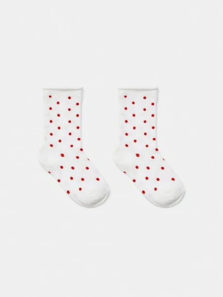 Белый цвет в сочетании с задорным красным горошком создает игривый и милый дизайн, который легко комбинируется с самой разной одеждой. От школьной формы до нарядных платьев — эти носки станут прекрасным дополнением к любому наряду. Благодаря своей универсальности, они подходят для носки в любое время года, обеспечивая тепло и уют в прохладные дни, и легкость в теплые.