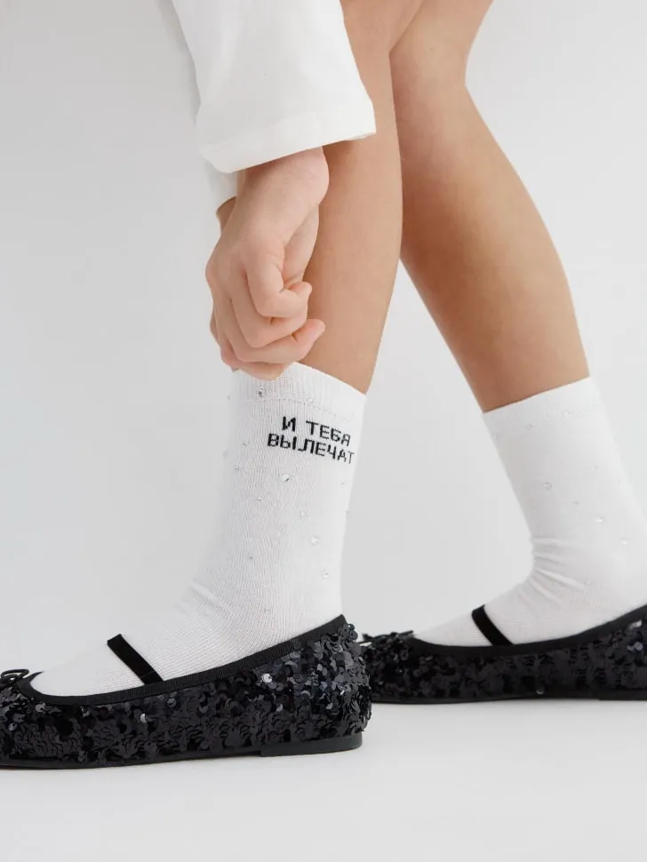 Носки и колготкиПредставляем вашему вниманию высокие носки для девочек из лимитированной коллекции SELA x Мосфильм — идеальный выбор для юных модниц, которые любят выделяться! Эти носки не просто согревают, но и становятся ярким акцентом в любом образе. Выполненные в классическом белом цвете, они украшены оригинальной надписью "И ТЕБЯ ВЫЛЕЧАТ" и деликатными блестящими стразами, которые придают изделию особую изюминку.