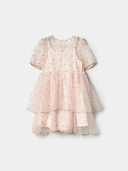 Нежный розовый цвет и милый принт в виде золотистых сердечек создают по-настоящему волшебный и трогательный образ. Платье выполнено из высококачественных, приятных к телу материалов, что обеспечит максимальный комфорт даже во время самых активных игр и танцев. Верхний полупрозрачный слой с короткими рукавами и многослойная пышная юбка добавляют платью объема, воздушности и игривости, делая его идеальным выбором для теплого времени года. Удобный крой не сковывает движений, позволяя девочке свободно наслаждаться каждым моментом. Пусть ваша дочь чувствует себя самой красивой и счастливой в этом особенном наряде! ✨ Отличный выбор для создания ярких и радостных воспоминаний.