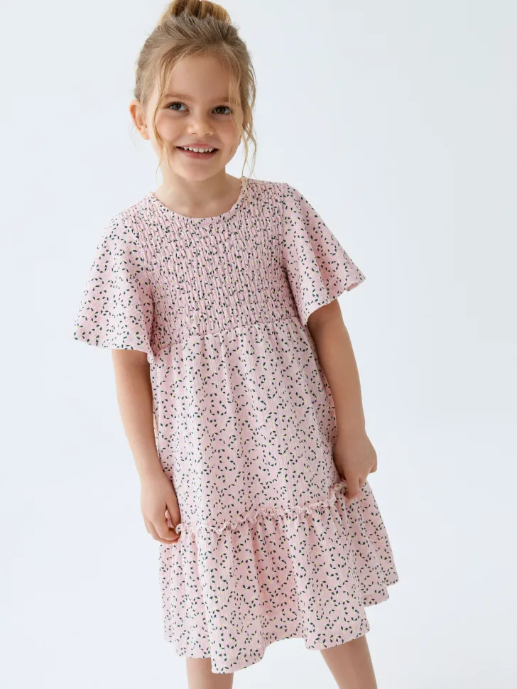 Платье выполнено из мягкой, дышащей ткани, которая обеспечивает максимальный комфорт даже в самые теплые дни. Нежный розовый оттенок в сочетании с аккуратным точечным принтом выглядит свежо и очень мило. Особенностью модели является эластичная вставка в верхней части, которая гарантирует отличную посадку по фигуре, не сковывая движений. Короткие рукава-крылышки добавляют платью легкости и очарования, а расклешенная юбка с воланом по низу создает игривый и романтичный силуэт. Подарите вашей девочке возможность чувствовать себя особенной в этом чудесном платье, которое подчеркнет её индивидуальность и подарит незабываемые эмоции!