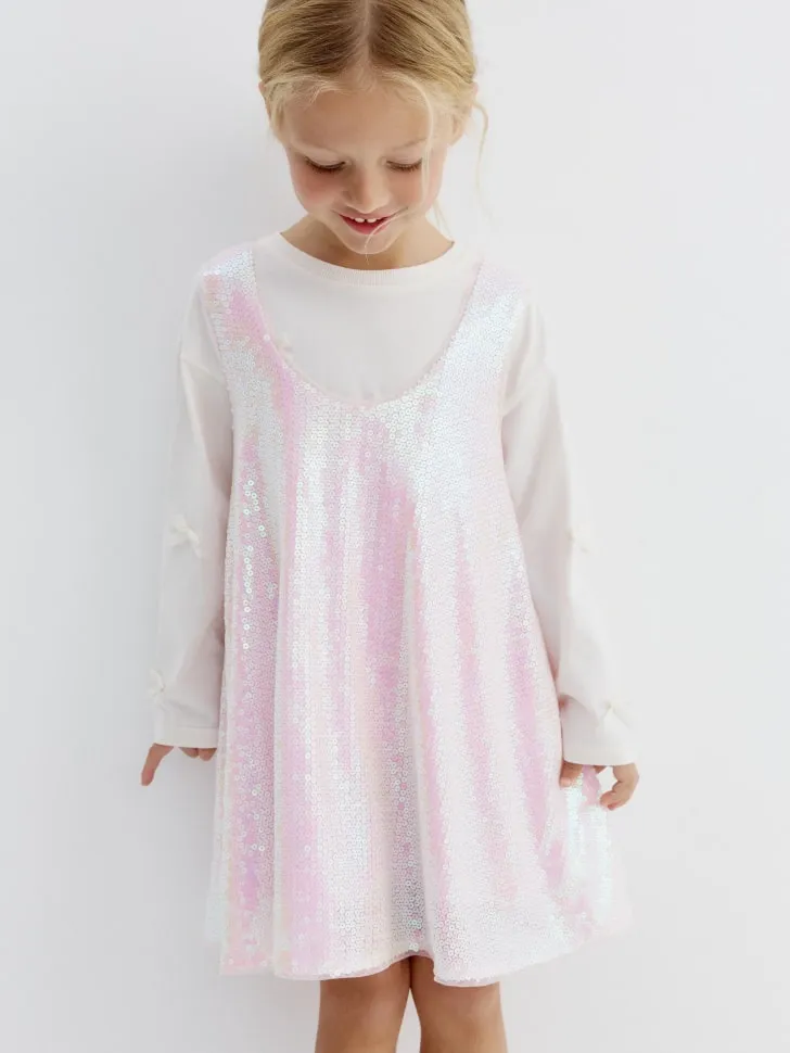 Представляем вашему вниманию волшебный сарафан с пайетками для девочек – идеальный выбор для юных модниц, которые любят быть в центре внимания! Этот наряд призван подарить вашей дочке ощущение настоящей звезды. Тысячи мерцающих пайеток, расположенных по всей поверхности сарафана, создают потрясающий переливающийся эффект, который меняет оттенки от нежно-розового до перламутрового белого при каждом движении. Ваша девочка будет сиять на любом празднике, утреннике или семейном торжестве, приковывая к себе восхищенные взгляды.