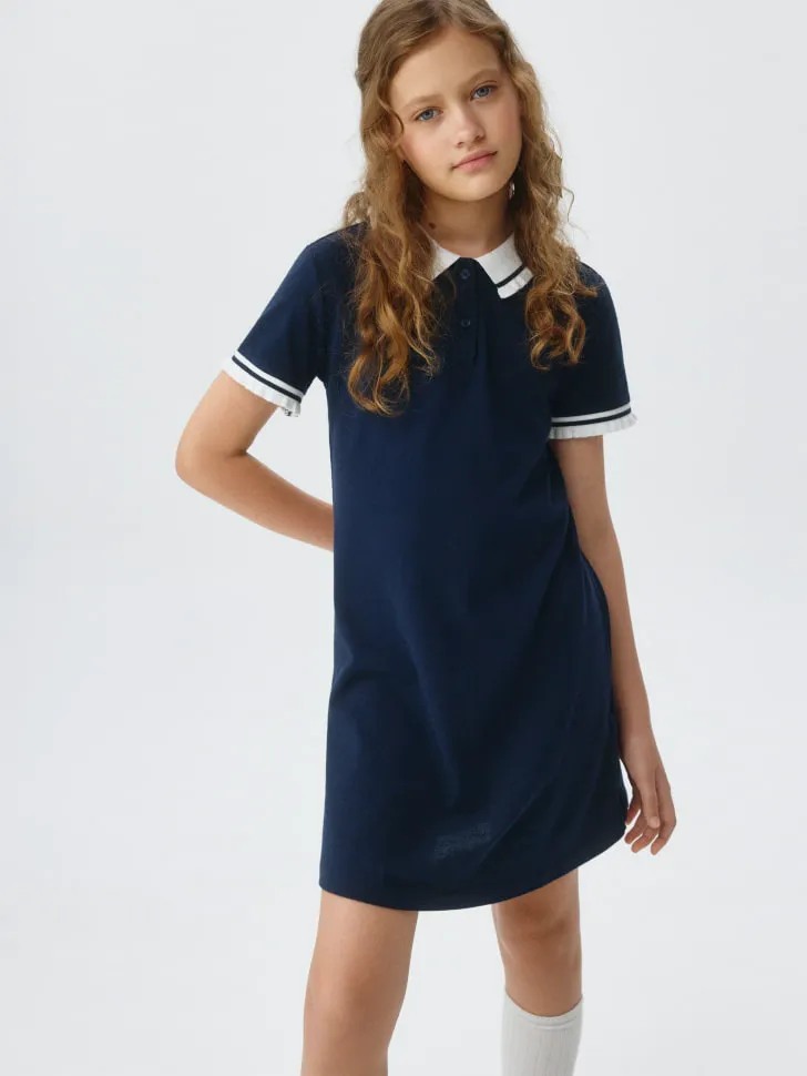 Представляем идеальное школьное платье для вашей девочки, сочетающее в себе классический стиль и современный комфорт. Это элегантное платье выполнено в глубоком темно-синем цвете, который является стандартом школьной формы и легко вписывается в любой гардероб. Отличительной особенностью является контрастный белый воротничок и аккуратные белые полоски на манжетах рукавов, придающие модели изысканность и строгость.
