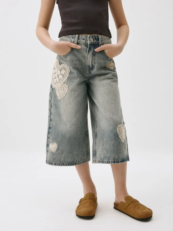 Шорты выполнены из высококачественного денима, обладающего прочностью и мягкостью, что гарантирует долгий срок службы и приятные ощущения при носке. Особенностью дизайна являются изысканные ажурные аппликации, расположенные по бокам, которые придают изделию неповторимый и нежный вид. Удлиненный крой обеспечивает дополнительный комфорт и свободу движений, делая эти шорты практичным выбором для игр и прогулок. Легко сочетаются с различными элементами гардероба, от футболок до летних блузок, позволяя создавать разнообразные и модные образы для вашей юной леди.